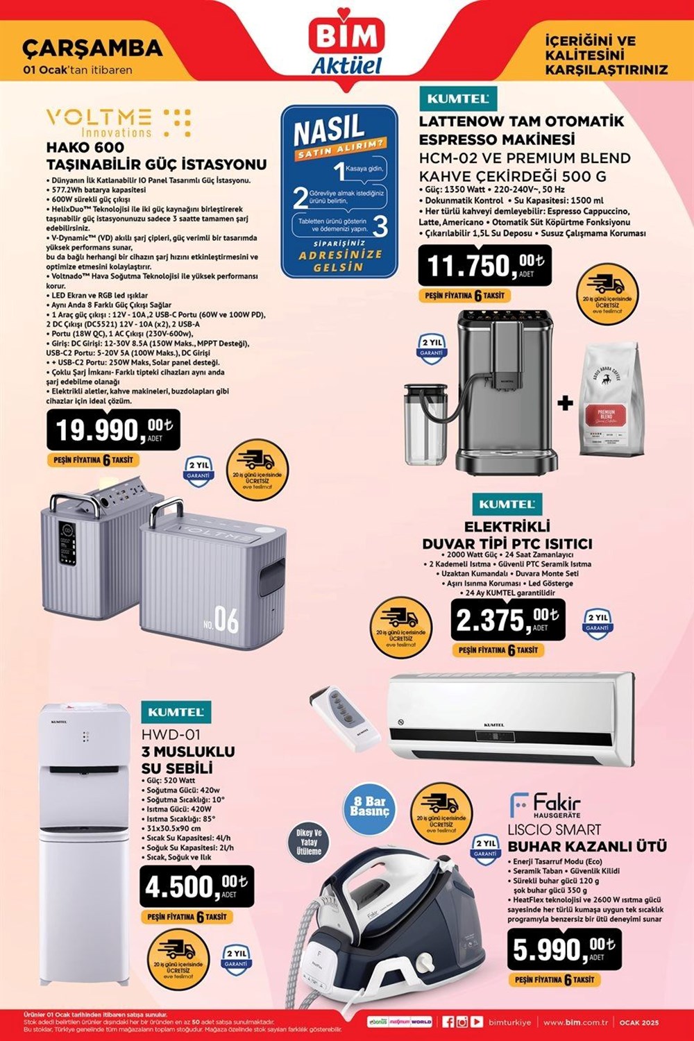 BİM market, 1 Ocak 2025 tarihinde geçerli yeni indirimli aktüel ürünler kataloğunu resmi internet sitesi üzerinden duyurdu. BİM indirimlerini kaçırmak istemeyen ve ucuz yolla alışveriş fırsatını değerlendirmek isteyen vatandaşlar, BİM güncel indirimli aktüel ürünler kataloğunu araştırıyor. BİM'de yeni yıla özel bu hafta taşınabilir güç istasyonu, espresso makinesi, duvar tipi ısıtıcı, su sebili, su arıtma cihazı gibi birçok üründe yeni indirimler yer alıyor. İşte 1 Ocak 2025 BİM markette bu haftanın indirimli ürünleri.