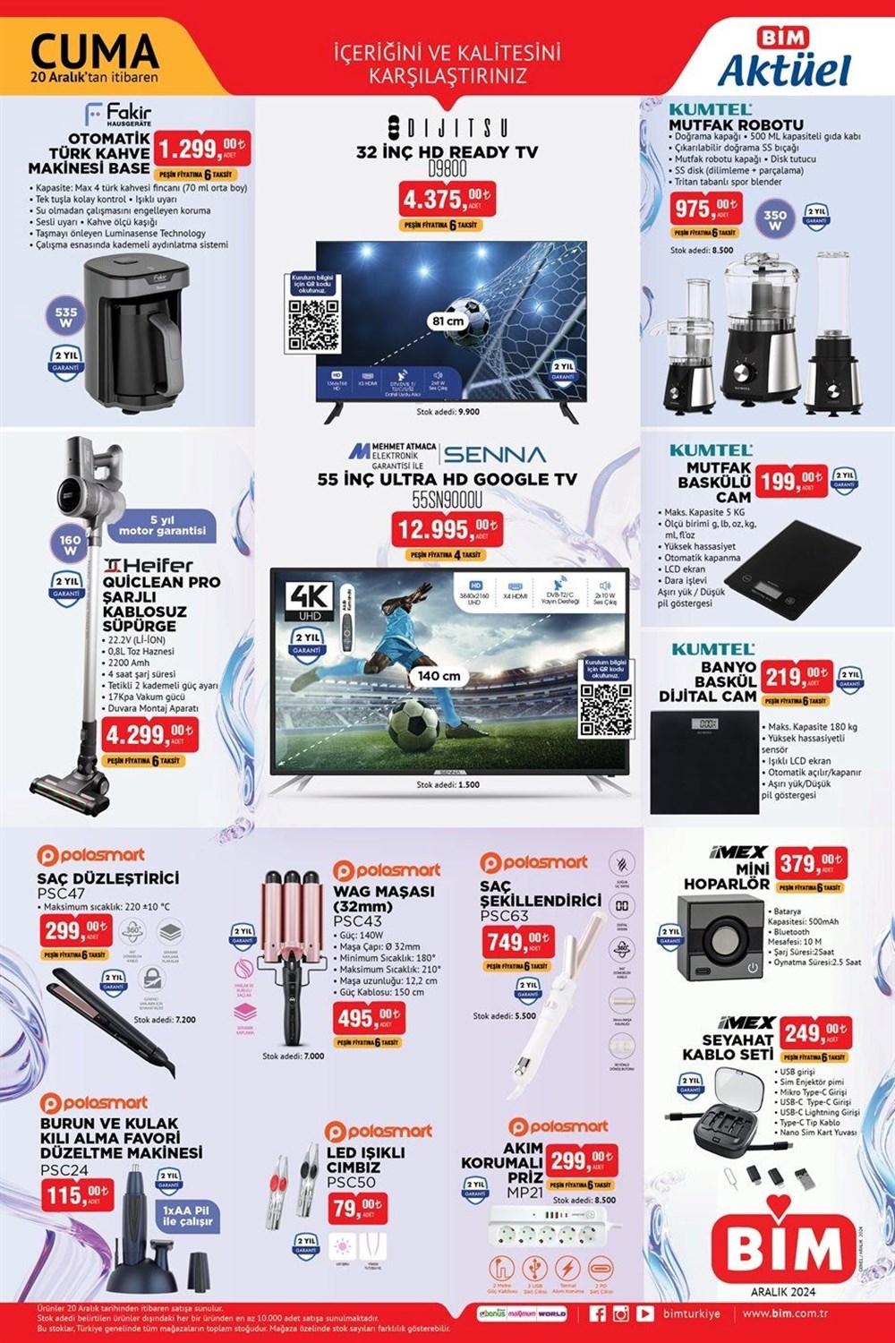 BİM market, 20 Aralık tarihinde geçerli yeni indirimli aktüel ürünler kataloğunu resmi internet sitesi üzerinden duyurdu. BİM indirimlerini kaçırmak istemeyen ve ucuz yolla alışveriş fırsatını değerlendirmek isteyen vatandaşlar, BİM güncel indirimli aktüel ürünler kataloğunu araştırıyor. BİM'de bu hafta mutfak robotu, Türk kahvesi makinesi, dijital baskül, seyahat kablo seti ve kilitli saklama kabı çeşitleri gibi birçok üründe yeni indirimler yer alıyor. İşte 20 Aralık BİM markette bu haftanın indirimli ürünleri.