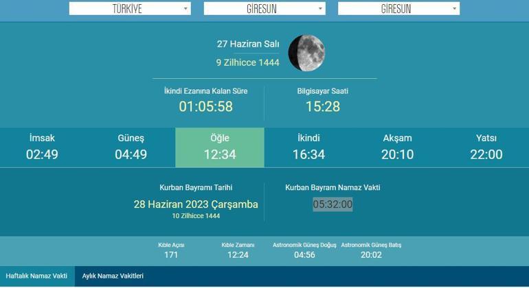 Kurban Bayramının birinci günü bayram namazı kılınacak. Diyanet’in duyurduğu takvime nazaran bayramın 1. gün 28 Haziran Çarşamba gününe denk geliyor. Giresun’da Bayram Namazı vakti 05.32 olarak açıklandı. Öteki büyük vilayetlerin bayram namazı saatleri ise şu biçimde;