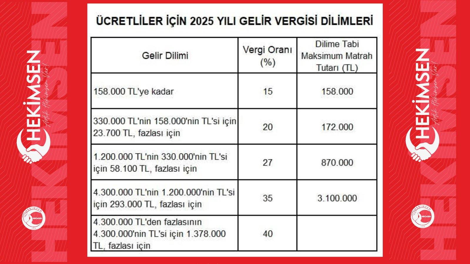 Hekimsen Sendikası X medyasından yaptığı açıklamada şu ifadelere yer verdi, “Maliye Bakanlığı tarafından belirlenen 2025 yılı vergi dilimleri, Resmi Gazete’de yayımlanarak yürürlüğe girdi. Belirlenen vergi dilimlerinin, günümüz ekonomisini yeterince yansıtmadığı ve hekimler ile diğer kamu çalışanlarının vergi dilimine daha erken aylarda gireceği açıktır. Kısacası, hekimlerimiz 2025 yılında da maaşlarının büyük bir kısmını vergi olarak ödeyerek, hatta bir maaşlarını kendilerine, bir maaşlarını ise devlete çalışarak geçireceklerdir. Maliye Bakanlığı’nın, vergi adaletini sağlayacak adil bir sistemi bir an önce hayata geçirmesi elzemdir” #MemuraVergiDilimi15 @HMBakanligi @memetsimsek