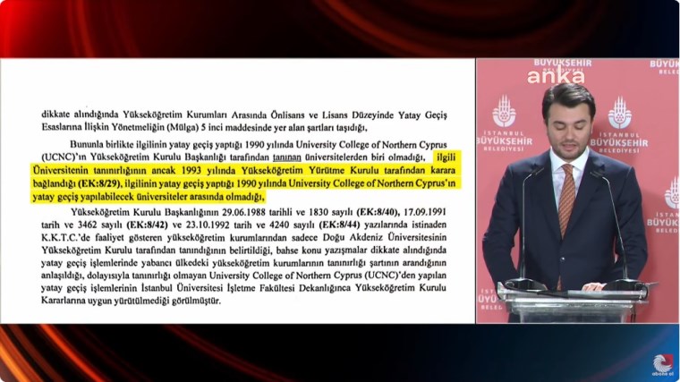 * Sayın İmamoğlu bu kriterleri sağlıyor ve İstanbul Üniversitesi İşletme Fakültesi Yönetim Kurulu da toplanıp geçişini onaylıyor. Zaten dikkatinizi çekerim ki Sayın İmamoğlu’nun değil, şartları karşılayan birçok vatandaşımızın başvurusunu da onaylıyor. Zaten bu kriterleri tutturduğu ve geçişinin de ancak öyle yapıldığı konusu YÖK raporunda da doğrulanıyor. Bunları belgeleriyle ve ayrıntılarıyla ortaya koymuştuk. Buna rağmen Sayın İmamoğlu’nun itibarını zedelemeye yönelik algı oluşturmak isteyen bazı kişilerin hala özel üniversiteden devlet üniversitesine geçti veya ÖSYM puanı tutmadığı halde İstanbul Üniversitesi’ne kabul edildi gibi iddialar ortaya attığını görüyoruz.