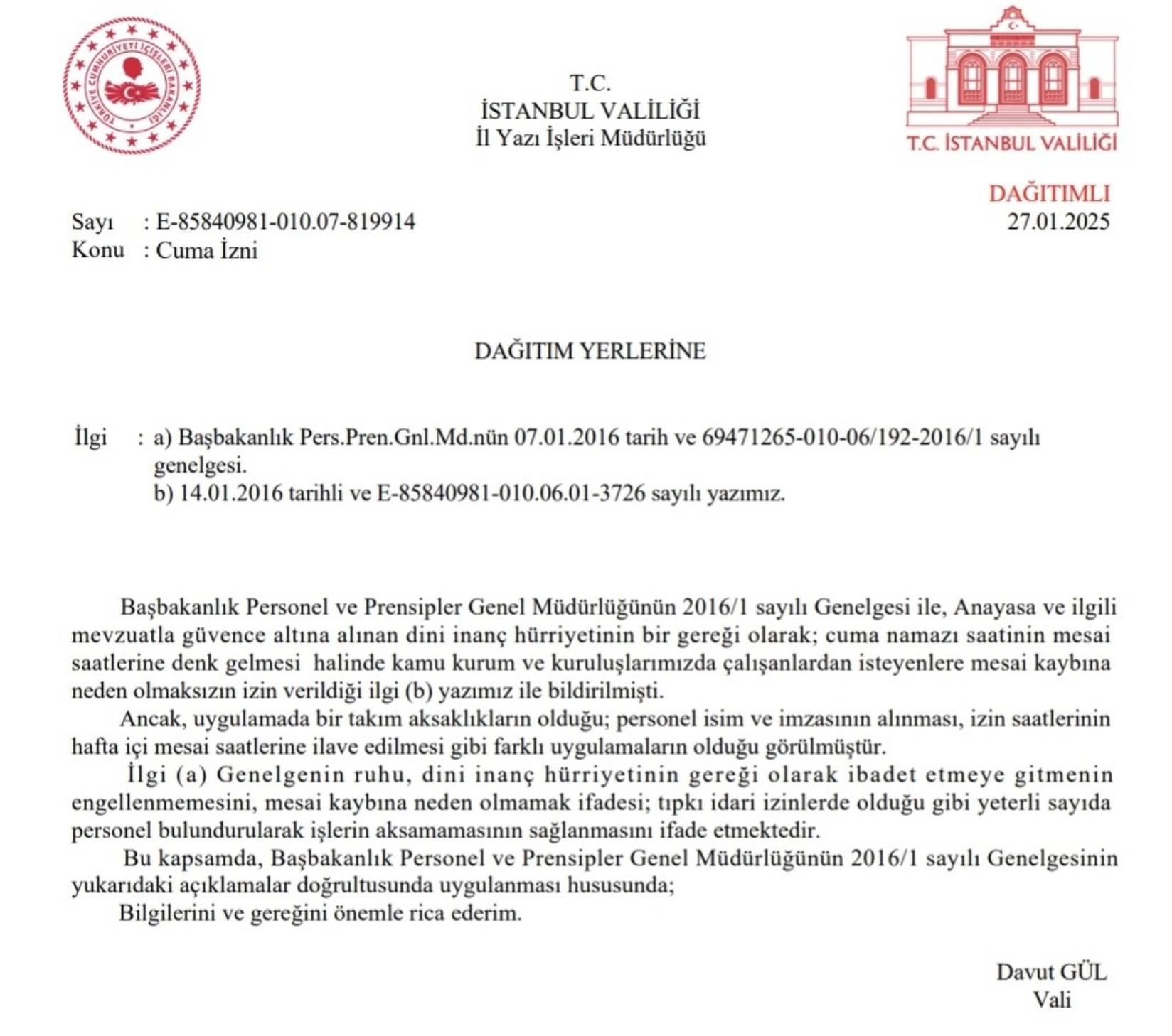 “Cuma Namazı saatinin çalışma saatlerine denk geldiği dönemlerde bazı kamu kurum ve kuruluşlarının, personelden imzalı evrak istediği ve Cuma Namazı süresini, mesai saatinin sonuna ekleyerek personelin mesai saati sonrasında çalışmasını talep ettiği tespit edilmiştir. İstanbul Valiliği olarak, bu uygulamanın sona erdirilmesi ve personelin Cuma Namazı saatinde idari izinli sayılması için İstanbul’daki tüm kamu kurum ve kuruluşlarına hatırlatma genelgesi yayımladık” (BSHA – Bilim ve Sağlık Haber Ajansı)