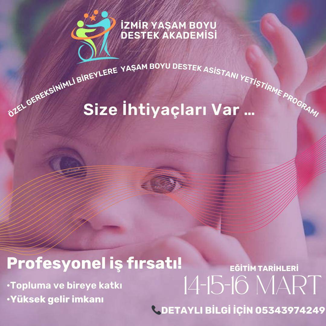 İzmir’de bir ilk gerçekleşiyor. İzmir Yaşam Boyu Destek Akademisi, özel gereksinimli bireylerin toplum yaşamına dahil olmaları; sosyal, kültürel, ekonomik hayatlarında yaşayacakları zorlukları ortadan kaldırmaları ve en aza indirmeleri için ihtiyaç duydukları destek kapsamında, yaşam boyu destek elemanlarının yetiştirilmesi amacıyla eğitim programları başlatılıyor. Programa katılan adaylara yönelik, 14-15-16 Mart 2025’te ilk eğitimini gerçekleştirecek olan akademide, söz konusu çalışmalar alanlarında uzman psikologlar tarafından verilecek eğitimler ile yetiştirilecek.